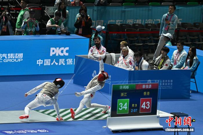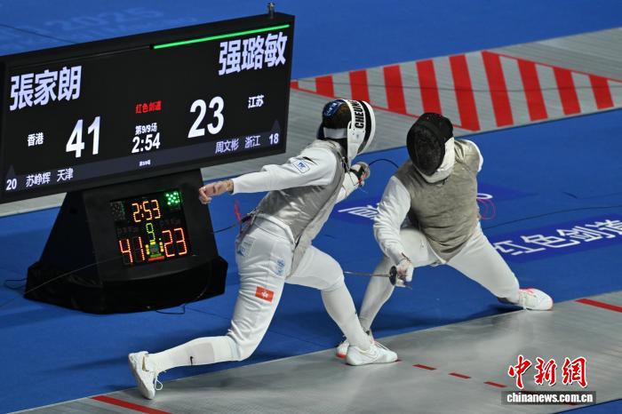 图为喷鼻港队选脚弛家朗(靠拢不雅赛区剑谈,左)对于阵江苏队选脚鹿恒睿。记者 李志华 摄