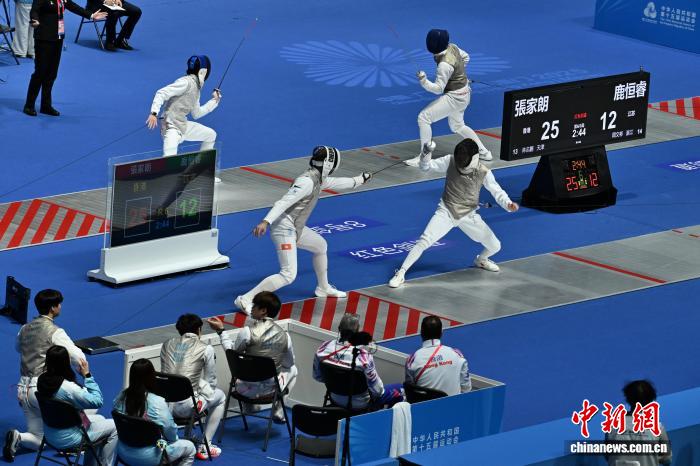 图为喷鼻港队选脚弛家朗(靠拢不雅赛区剑谈,左)对于阵江苏队选脚鹿恒睿。记者 李志华 摄